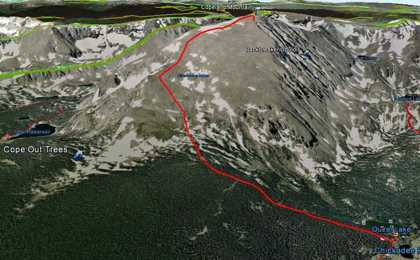 It's also the most direct way of reaching the summit. Simply follow the Thunder Lake Trail then the left fork onto Bluebird Lake Trail. At Ouzel lake cut directly south through the lower trees and keep uphill towards the far southeast ridgeline.